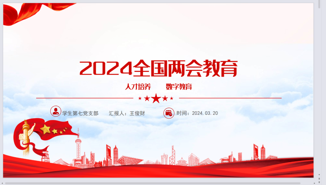 (文/学生第七党支部图/张井显)为使支部成员加强全国两会精神的学习,建筑工程学院学生第七党支部于2024年3月25日下午在建工北一开展“学习两会精神,阔步新时代”主题党日活动。本次会议由组织委员王俊财同志主持,支部全体党员和入党积极分子参加。