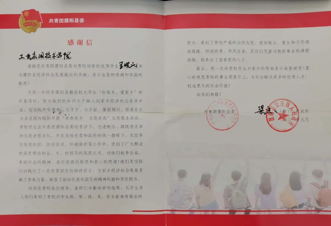 建筑工程学院为深入贯彻落实习近平总书记关于防汛救灾工作和打赢新冠肺炎疫情防控阻击战的重要指示精神,加强环境保护意识,并鼓励学生积极参与家乡建设、生态环保等工作中去,厚植家乡情怀,我院动员学院学子们积极参与“暑期三下乡”活动。建工学子踊跃报名参与家乡建设中去,组织成了一支有力量、蓬勃向上的志愿者队伍,为乡村(社区)的发展贡献力量。今日我院收到了共青团濮阳县委对我院20级城乡规划(专升本)1班王晓民同学的感谢信。