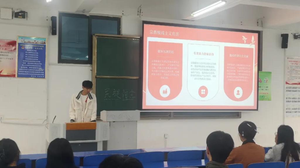 (图/李竞择 文/刘晓逾)为深入贯彻落实党的宗教工作基本方针,切实筑牢党员抵御宗教渗透、防范邪教侵蚀的思想防线,建筑工程学院学生第六党支部于9月23日在建工北一开展“宗教双防宣传”主题党日活动。本次活动由朱浩楠同志主持,支部全体成员参加。