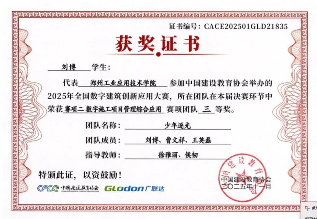 作为工程管理专业的学子,刘博始终将专业能力的锤炼作为立身之本。他在各类专业竞赛中敢闯敢拼,用扎实的专业功底和创新思维屡创佳绩: