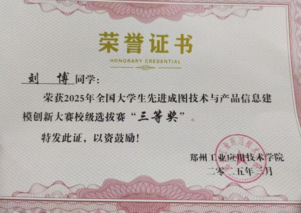 • 此外,他还在全国大学生先进成图技术与产品信息建模创新大赛校级选拔赛、全国大学生数学建模竞赛、校“挑战杯”竞赛中斩获三等奖。