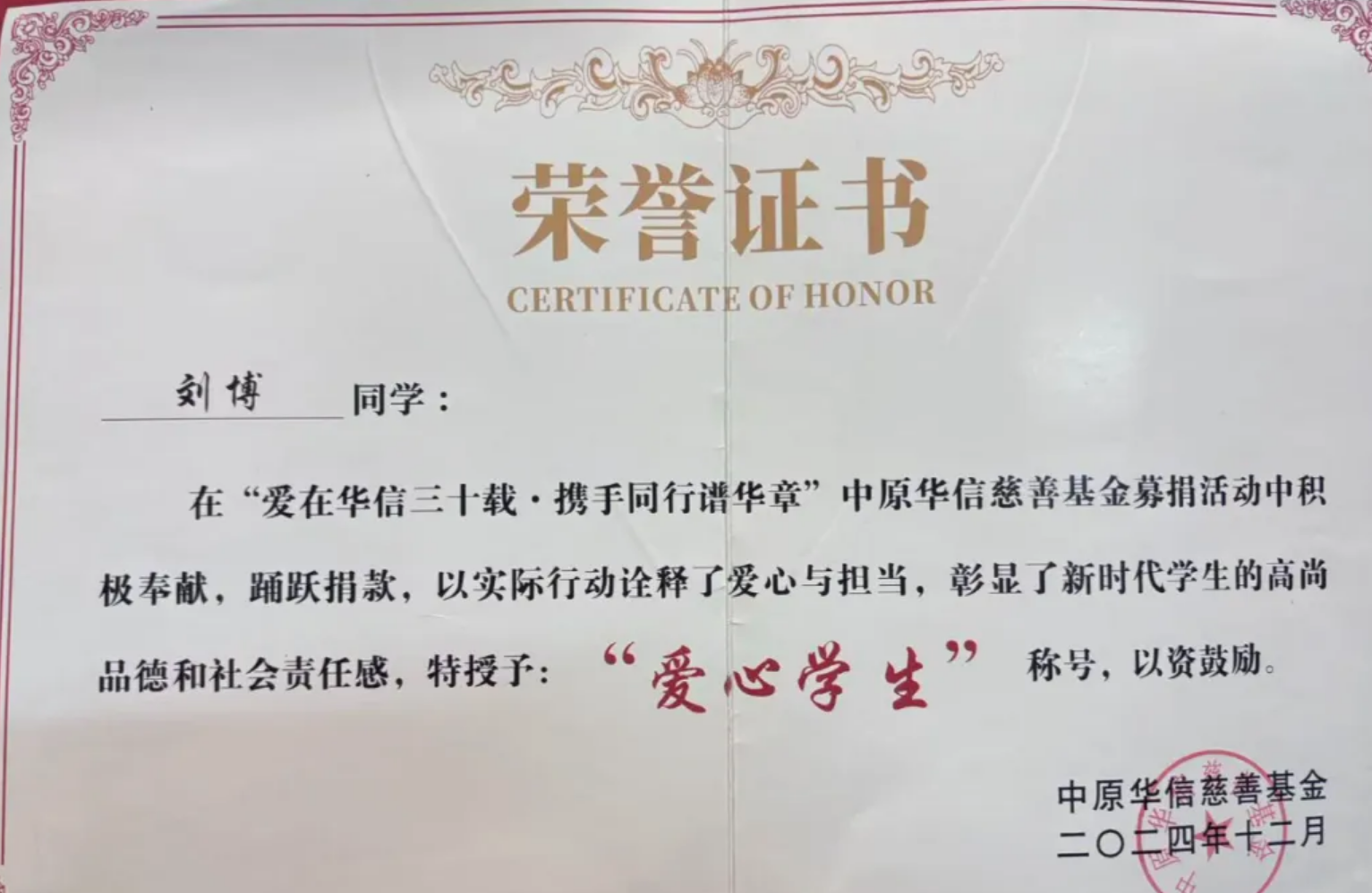 赛场之外,刘博是热心公益的“行动派”。他在中原华信慈善基金募捐活动中积极捐款,被授予“爱心学生”称号;他在日常工作中默默付出,用点滴行动践行着党员的责任与担当。
