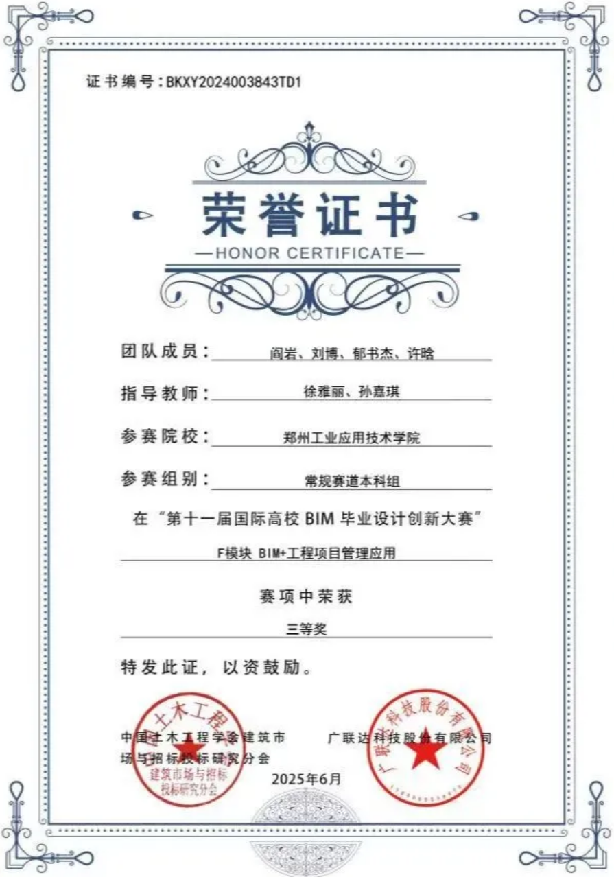 • 在第十一届国际高校BIM毕业设计创新大赛F模块BIM+工程项目管理应用赛项中,与团队斩获三等奖;