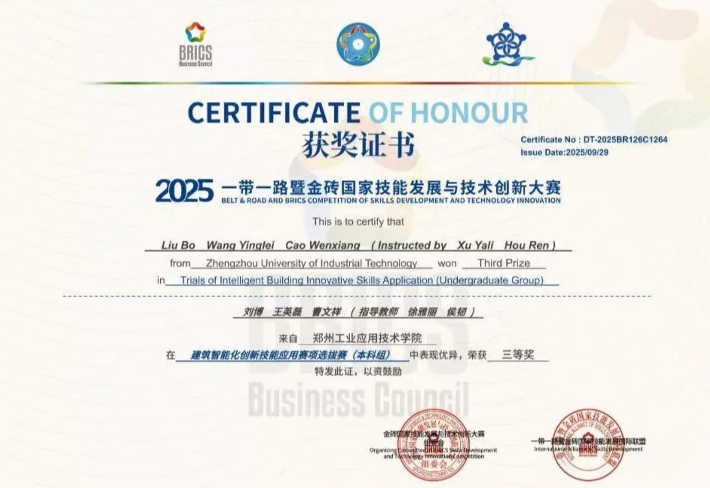 • 在2025一带一路暨金砖国家技能发展与技术创新大赛中,于建筑智能化创新技能应用赛项斩获三等奖;