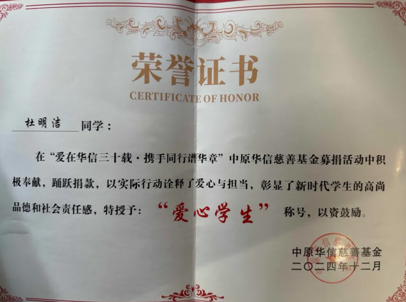 她积极参与“爱在华信三十载·携手同行谱华章”中原华信慈善基金募捐活动,因踊跃捐款、积极奉献的表现,被授予“爱心学生”称号,用实际行动诠释了新时代青年的社会责任。