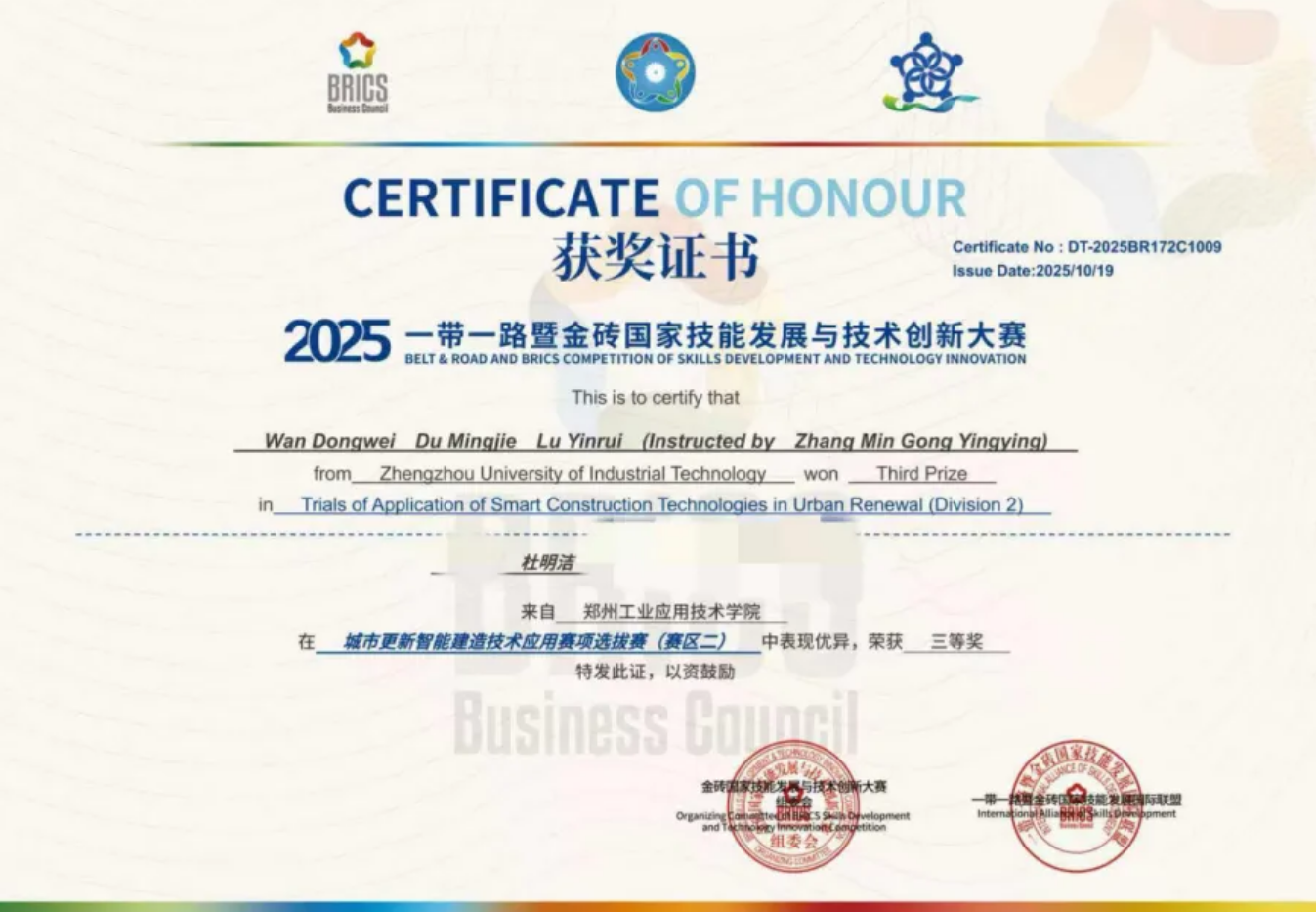 在专业学习之余,杜明洁注重实践能力和创新能力的培养,积极参与学科竞赛和技能比拼。在2025一带一路暨金砖国家技能发展与技术创新大赛中,她与团队成员并肩作战,凭借扎实的专业知识和团队协作能力,在“城市更新智能建造技术应用赛项选拔赛(赛区二)”中斩获三等奖,展现了过硬的专业素养和勇于挑战的精神。