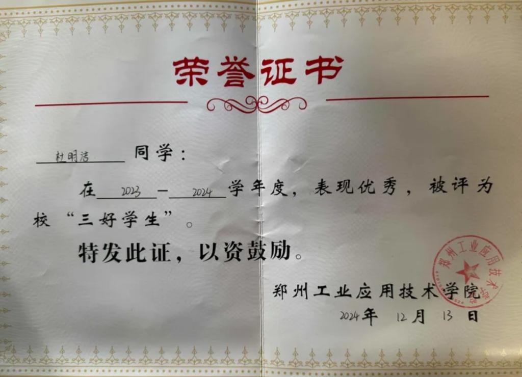 在学习上,杜明洁始终保持勤奋刻苦的态度,课堂上认真听讲、积极思考,课后主动梳理知识点、拓展学习视野,学业成绩始终名列前茅。凭借优异的表现,她连续两次荣获校级“三好学生”称号,还获得院级“三好学生”荣誉,成为班级同学学习的榜样。