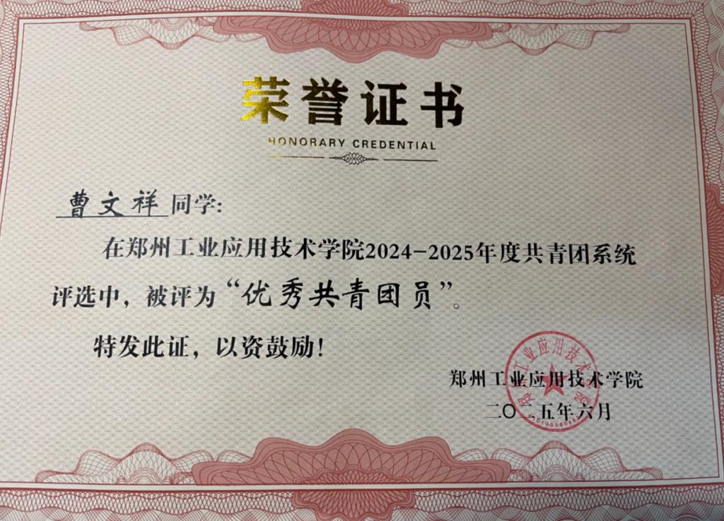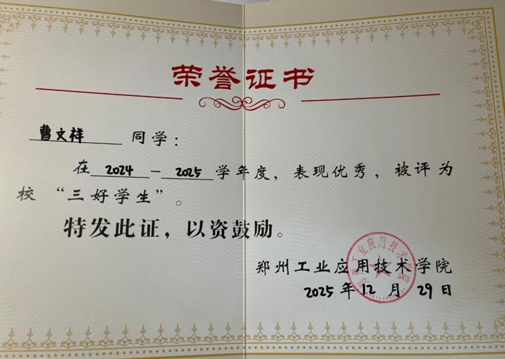 在学生工作与集体建设中,他同样以身作则。作为团支书他所在的2023级工程管理专业(BK)1班团支部获评校级“五四红旗团支部”;个人也先后荣获“优秀共青团员”“三好学生”等称号,以扎实的作风服务集体、凝聚同学。他深知“党员”二字不仅是荣誉,更是责任,因此在日常学习生活中始终以高标准要求自己,带动身边同学共同进步。