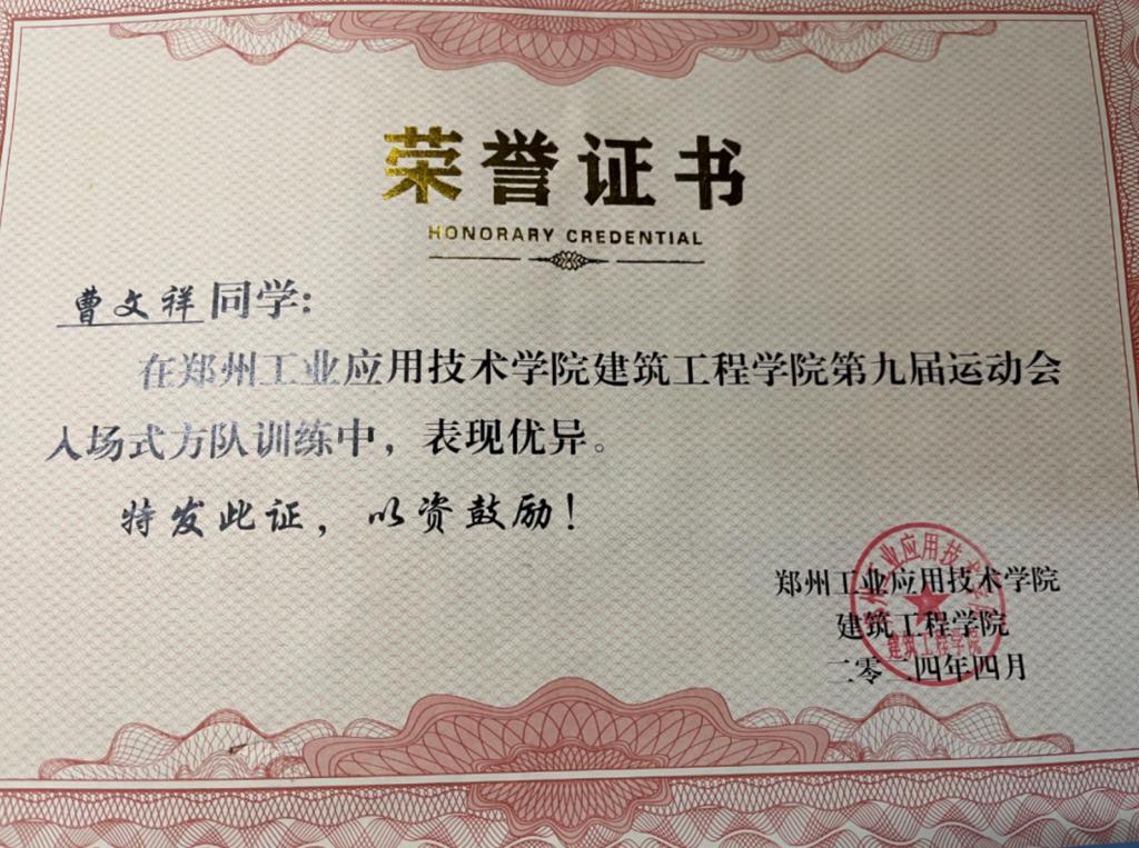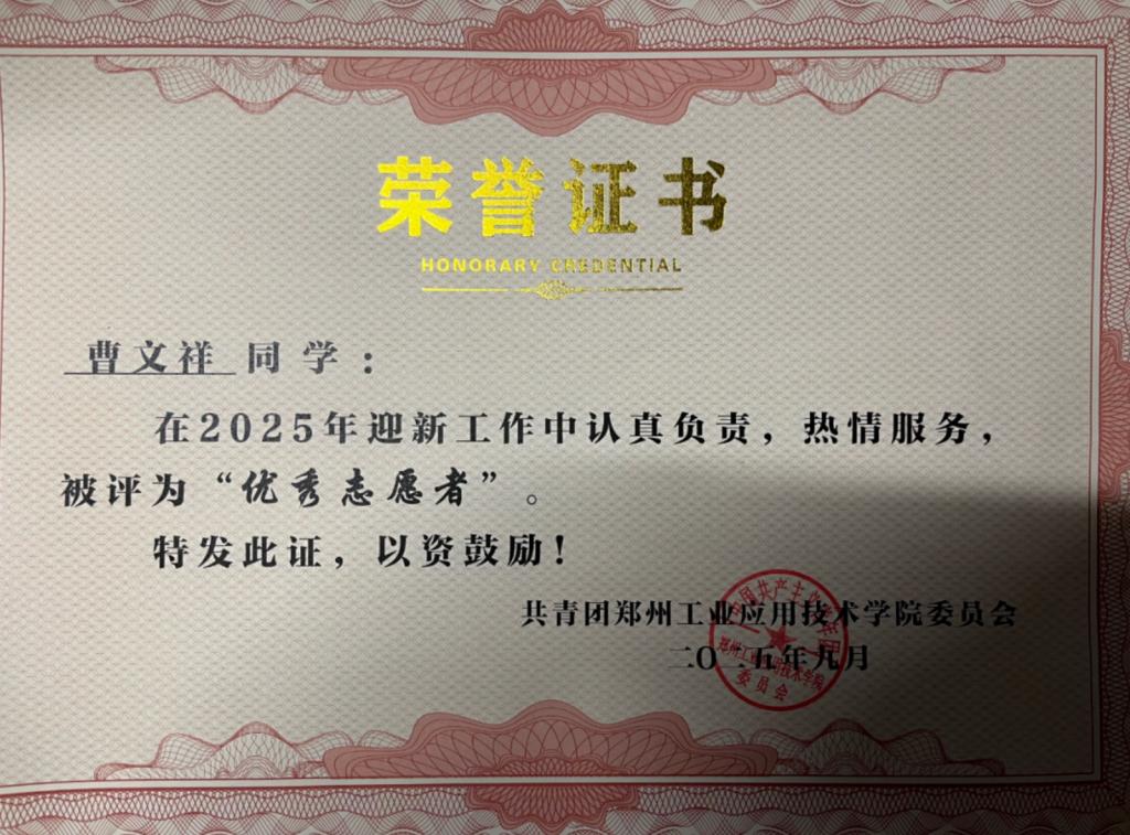 志愿服务与校园活动的一线,也总能看到他的身影。在2025年迎新工作中,他以认真负责的态度和热情细致的服务获评“优秀志愿者”,帮助新生顺利融入大学生活;在学院第九届运动会入场式方队训练中,他不畏辛苦、反复打磨动作,展现了坚韧的团队精神;凭借全年累计数十小时的社会服务贡献,他还斩获校专项奖学金“二等社会服务奖”,用点滴行动温暖他人、回馈社会。