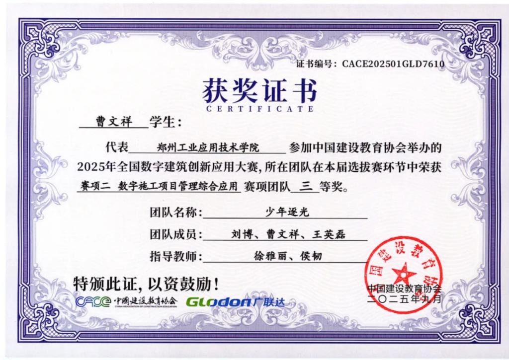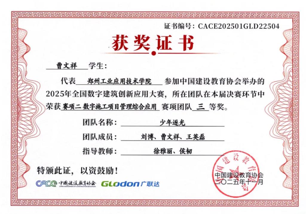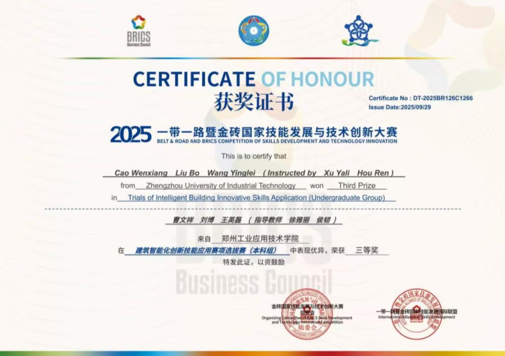 作为一名学生党员,他始终秉持“知行合一、服务奉献”的信念,在学业与实践中双向奔赴。在专业领域里,他深耕数字建筑与智能建筑技术,作为核心成员代表学校参加全国数字建筑创新应用大赛,从选拔赛到决赛均斩获三等奖;更走出国门,在一带一路暨金砖国家技能发展与技术创新大赛中与多国选手同台竞技,最终斩获三等奖,将专业知识转化为硬核成果,展现了中国青年学子的专业实力与创新活力。